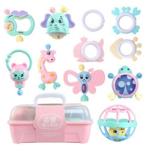 Teether baby plastic toy gift box set / Mainan plastik bayi penggoncang gigitan set / 婴儿牙胶摇铃玩具